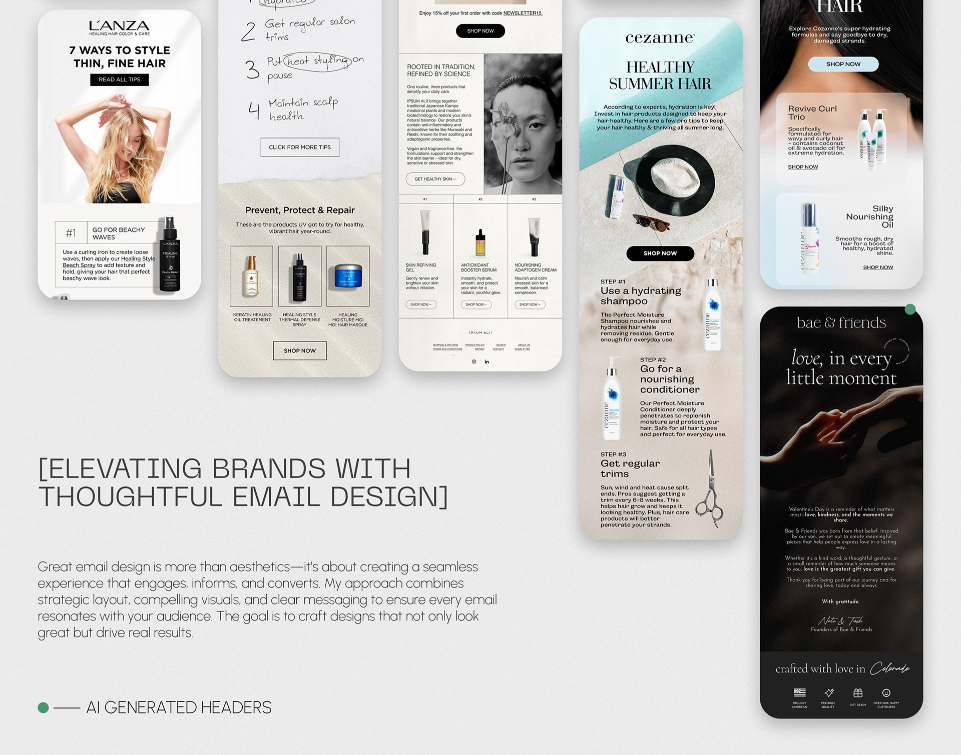 Great email design is more than aesthetics—it’s about creating a seamless experience that engages, informs, and converts. My approach combines strategic layout, compelling visuals, and clear messaging to ensure every email resonates with your audience. Let’s craft designs that not only look great but drive real results.